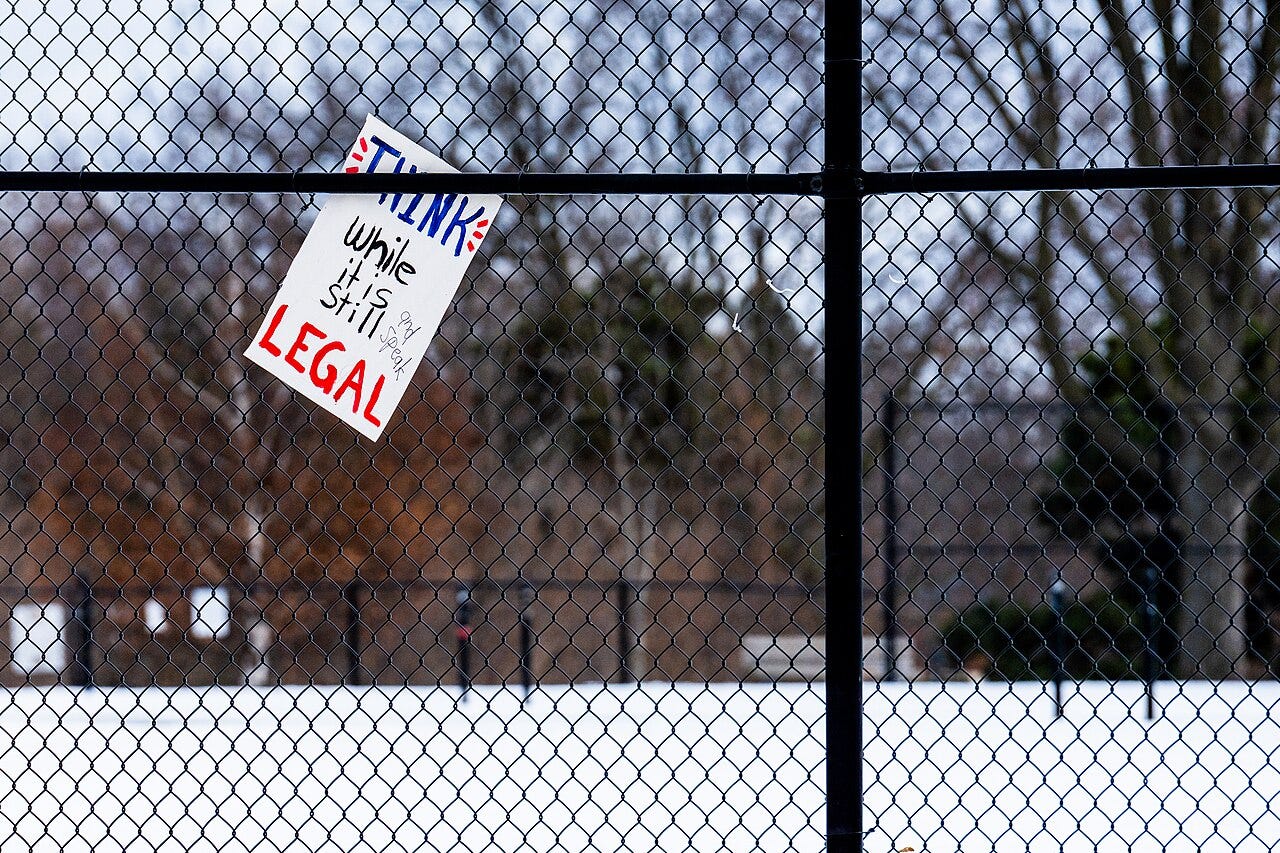 A sign stuck to a fence in Minneapolis on January 13, 2026, that reads “Think while it is still legal.” Photo by Chad Davis, CC BY 4.0
